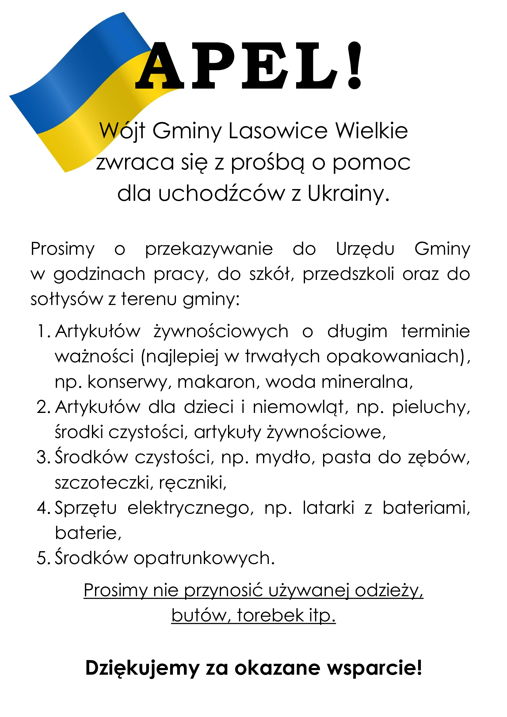 Wójt Gminy Lasowice Wielkie zwraca się z prośbą o pomoc dla uchodźców z Ukrainy!