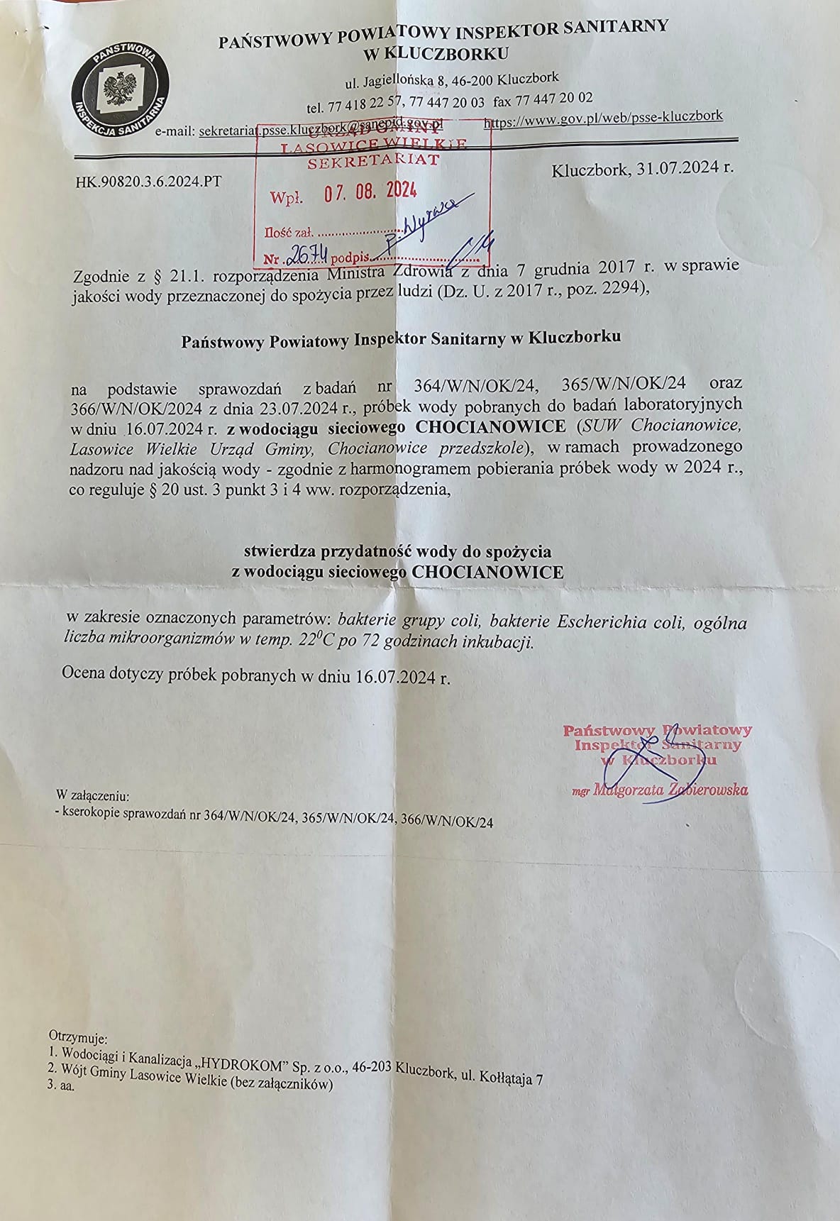 Stwierdzenie przydatności wody do spożycia - 31.07.2024